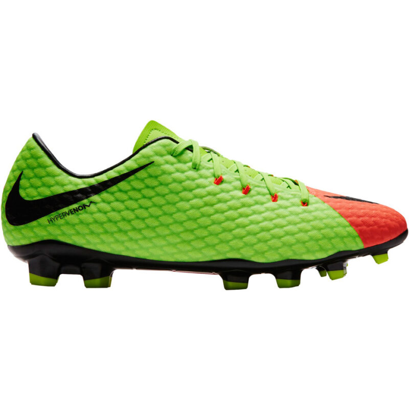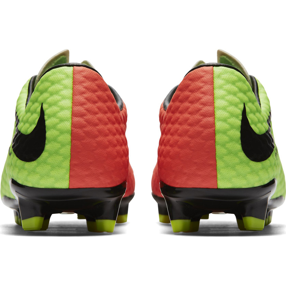 Męskie buty piłkarskie Nike Hypervenom Phelon III FG z kolekcji Radiation Flare Pack 2017 to idealne buty dla średnio zaawansowanych zawodników. Przeznaczone na naturalne nawierzchnie trawiaste. Wkładka buta jest idealnie wyprofilowana, pełni funkcje amortyzującą. Cholewka wykonana jest z syntetycznej skóry. Kontrolę nad piłką zwiększa wyraźny, wytłaczany wzór na cholewce. Podeszwa naśladująca krzywiznę stopy umożliwia utrzymanie prawidłowej przyczepności podczas szybkich zwrotów na boisku. Rozdzielony język umożliwia wygodne dopasowanie.
